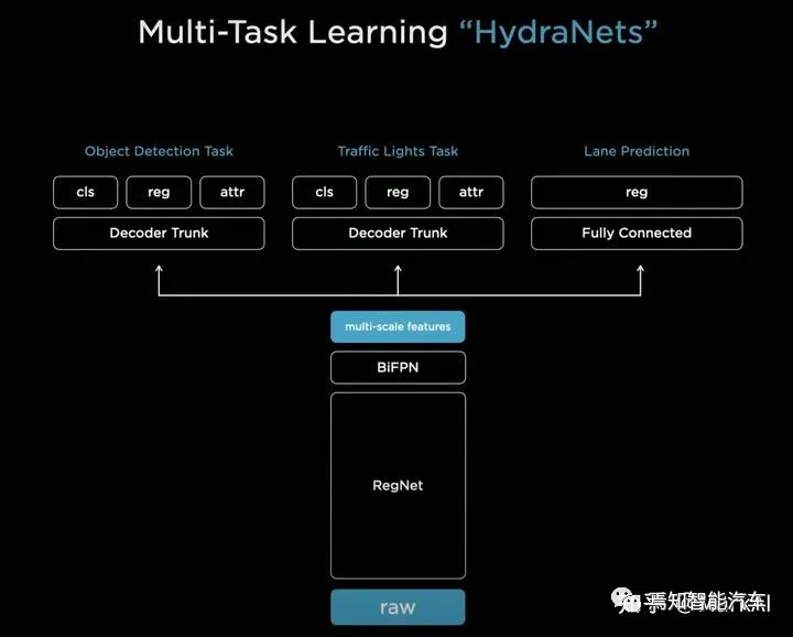 HydraNet以分辨率为1280×960,12-Bit, 36Hz的RAW格式图像作为输入,采用的Backbone为RegNet,并使用BiFPN构建多尺度feature map,再在上面再添加task specific的Heads。