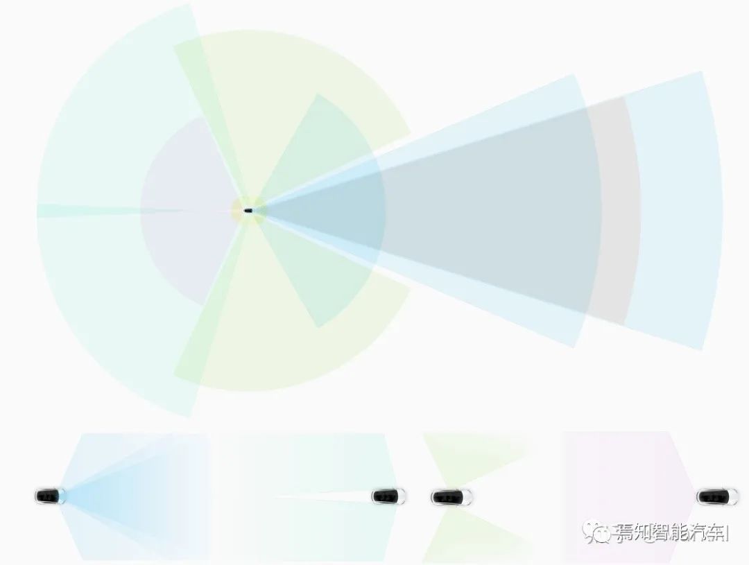 Tesla有8个摄像头,其中前视有3个,负责近中远3种不同距离和视角的感知;侧后方两个,侧前方两个,以及后方单个,完整覆盖360度场景。