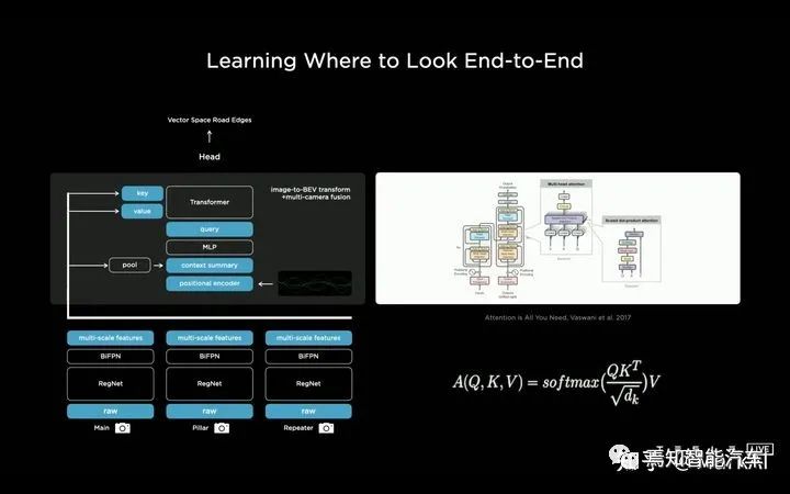 关于将图像空间的特征转换到vector space,Tesla采用的方案是直接使用一个Multi-Head Attention的transformer来表示这个转换空间,而将每个摄像头的图像转换为key和value。