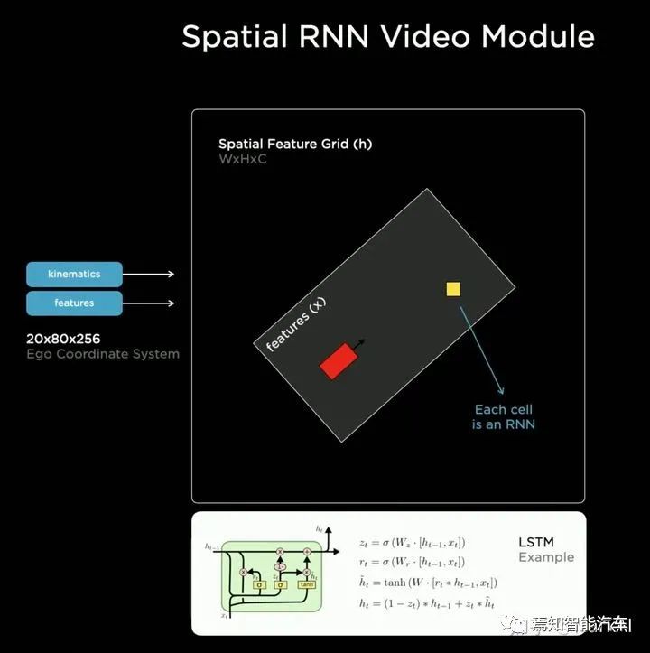 前面提到的特征队列只是用来组织时序信息,接下来介绍的视频模块要用来整合这些时序信息。Tesla团队选择了使用RNN结构来作为视频模块,并命名为空间RNN模块(Spatial RNN Module)。