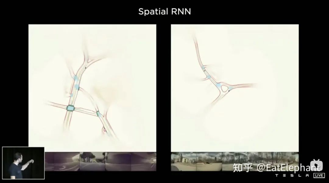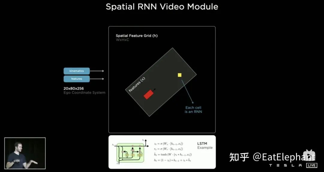 3D Conv, Transformer,RNN都能处理序列信息,三者在不同任务上各有长短,但大部分时间采用哪个方案其实区别不大,然而AI Day上Karparthy另外分享了一个简单有效,而且效果十分有趣可解释的方案叫做Spatial RNN。与上面三个方法有所不同,Spatial RNN由于RNN原本就是串行处理序列信息,帧间前后顺序得以保留,因此无需将BEV视觉特征进行位置编码就可以直接给进RNN网络,因此可以看到这里输入信息就只包括20x80x256的BEV视觉Feature Map和1x1x4的自车运动信息。