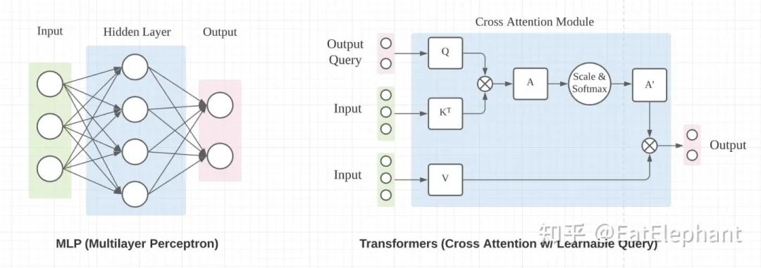 主流的能进行空间尺度上变换的神经网络操作主要有MLP中Fully Connected Layer和Transformer中Cross Attention两种办法,如下图所示(图片引用自towardsdatascience.com/),二者都可以改变输入量的空间尺度,从而达到进行尺度变换的目的。