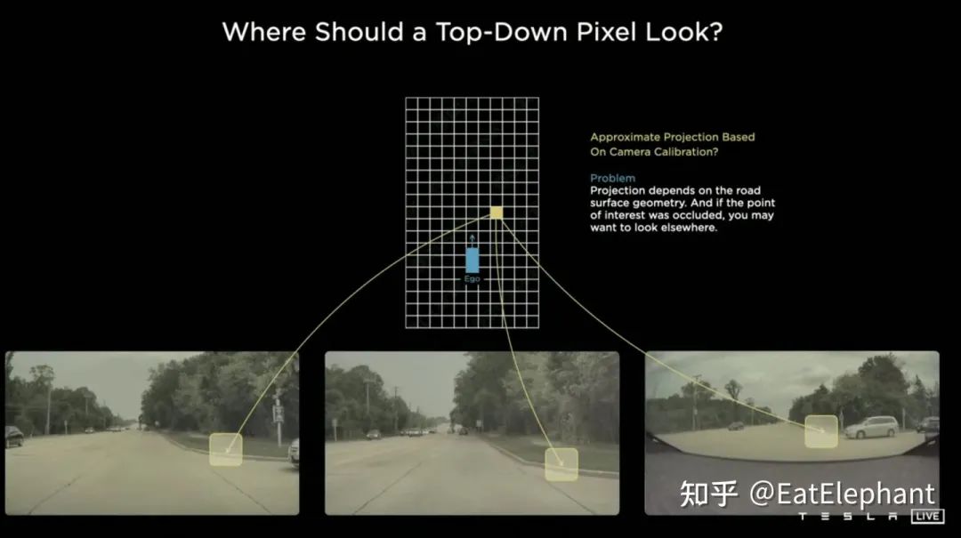 传统方案利用相机外参以及地面平面假设便可使用称作IPM(Inverse Perspective Mapping)的方法将图像平面的感知结果反投影回自车BEV坐标系,Tesla原本的方案也是这么做的,然而当地面不满足平面假说,且多相机视野关联受到各种复杂环境影响的时候,这类方法就会变得越来越难以维护。