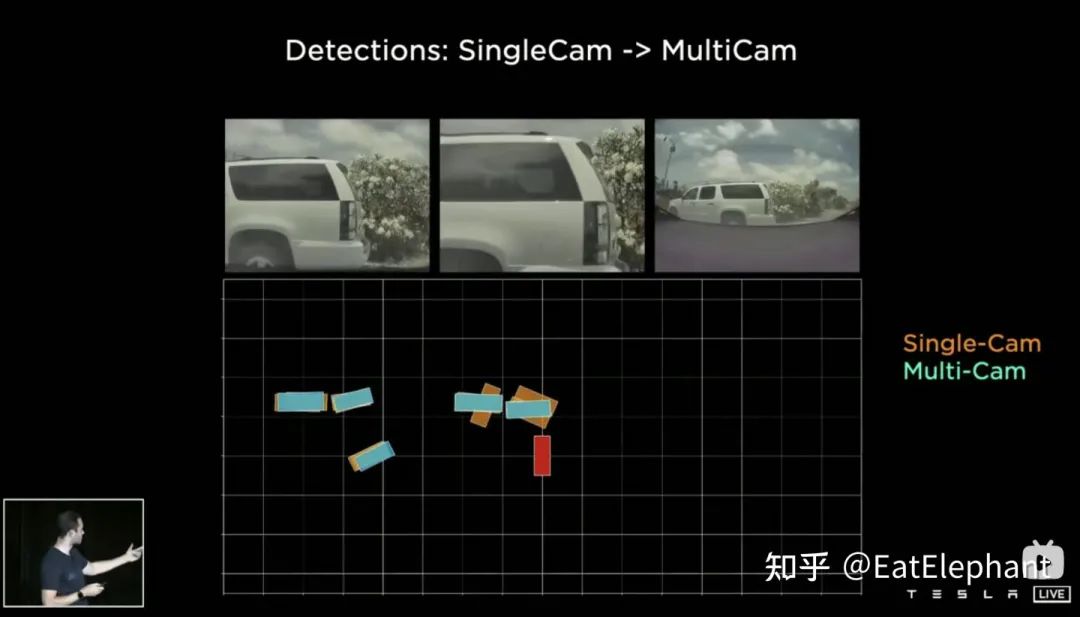 通过这种方法,实际上相机外参以及地面几何形状的变化都在训练过程中被神经网络模型内化在参数里边。这里存在的一个问题就是使用同一套模型参数的不同车子的相机外参存在微小的差异,Karparthy在AI Day上补充了一个Tesla应对外参差异的方法:他们利用标定出来的外参将每辆车采集到的图像通过去畸变,旋转,恢复畸变的办法统一转换到同样一套虚拟标准相机的布设位置,从而消除了不同车相机外参的微小差别。