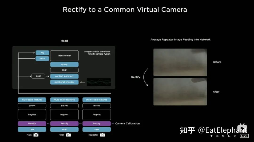 特斯拉在原始图像进入神经网络模型前增加了Rectify的操作,利用相机标定参数去除相机安装的误差影响