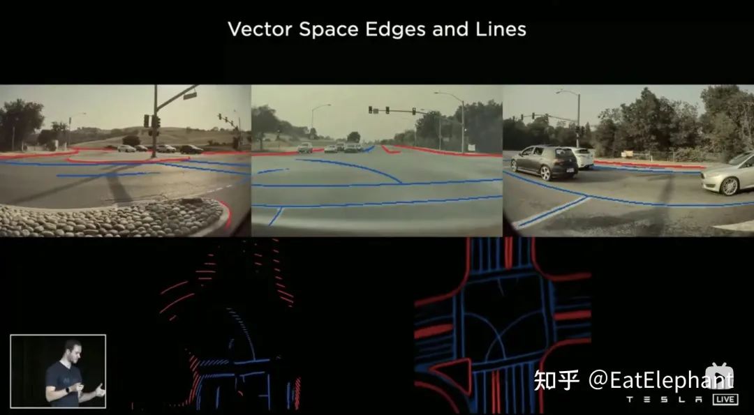 有了数据驱动的BEV变换,Tesla感知直接输出在BEV Vector Space下,如途中右下角所示