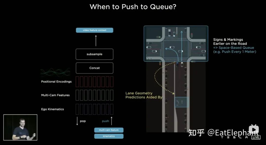 人类的记忆究竟是如何工作的仍旧是脑科学中未解的谜题之一,因此AI算法至今仍旧无法重构人类的长期记忆能力。不过Tesla希望通过使用具有时序信息的视频片段替代图像对神经网络进行训练,从而使感知模型具有短时间的记忆的能力,实现这个功能的方法是分别引入时间维度和空间维度上的特征队列进入神经网络模型。针对为什么需要空间维度的特征队列Karparthy举了一个例子,如果车子行驶到红绿灯路口停止,车子在到达路口前观察到了各车道允许行驶方向的箭头,然而如果单纯依靠时间队列,那么当红灯非常长的时候,前面时刻观察到的车道方向终究会被遗忘,但如果引入空间队列,那么由于红灯下车子没动,无论在红绿灯路口停止多久,空间队列仍能保留对前面观察到的车道行驶方向的记忆。