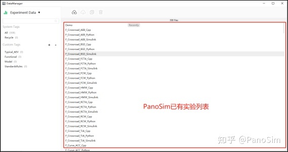 Data Tools 区 域 主 要 负 责 对 实 验 文 件 的 管 理 功 能 , 点 击“Save”、“Save As”和 “DataManager”可以打开实验文件保存、另存为和调出数据管理器界面。如图 4.9 所示,数 据管理器界面中会显示当前 PanoSim 中已有的实验文件,以便用户查看和管理。