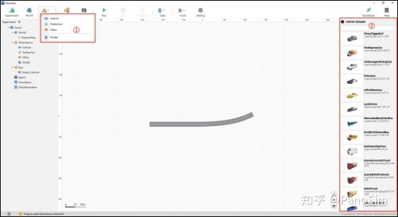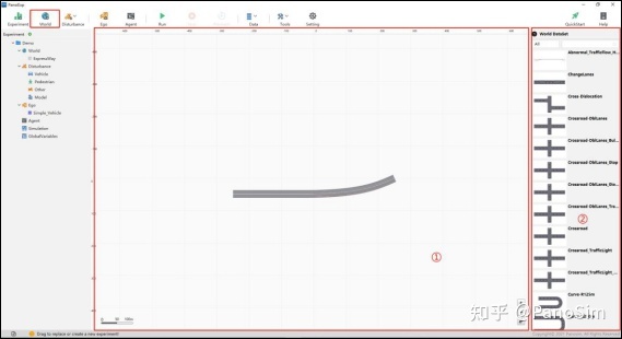 区域② :显示 PanoSim 数据库中已有的道路模型文件。用户可以左键单击道路文件并 按住拖到区域①中加载场景文件。
