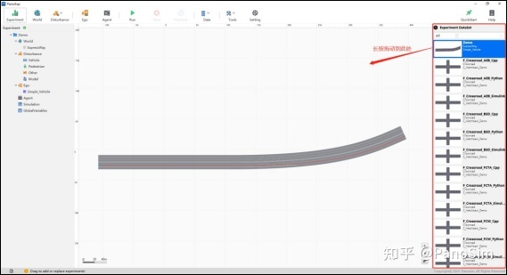 工作区可以被用来对场景中的车辆个数、行驶路径等信息进行展示和修改。当用户需 要将脚本、实验文件或者车辆模型添加到道路中时,可以通过选中文件并以长按鼠标左键拖动的方式将对应文件拖到工作区,松开左键即可成功加载拖入文件,操作如图 4.15 所示:
