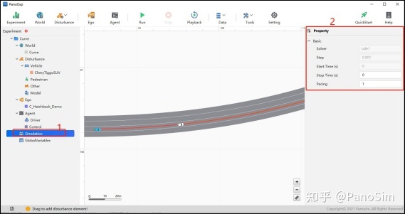 Simulation 功能主要负责对 PanoSim 仿真停止时间等信息进行设定。目前默认求解器类 型是 ode1(常微分方程,Ordinary Diffrential Equation),仿真步长为 0.001s,5.0 版本暂不 支持求解器及仿真步长的修改,可支持对仿真结束时间(StopTime)和仿真速度(Pacing) 进行设置。