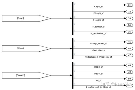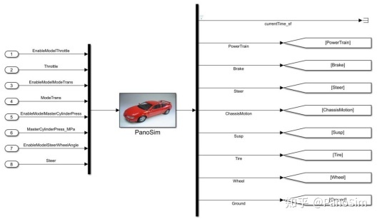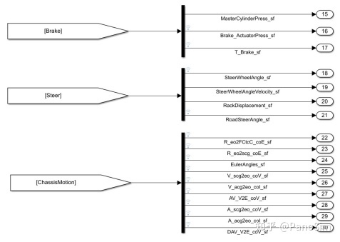 PanoSim 车辆动力学模型的输入支持 4 个使能接口及其对应的控制信号接口,141 个状态变量输出接口。PanoSim 车辆动力学模型的 Simulink 模型如下图 5.1 所示。