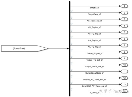 车辆动力学控制输入接口包括油门(Throttle)、变速器挡位(Mode Trans)、制动主缸压力(MasterCylinderPress_MPa)、方向盘转角(Steer)及其分别对应的使能信号输 入。输出接口分类为 8 个子系统,分别是动力总成、制动系统、转向系统、簧上质量、悬架、轮胎、轮毂、地面,各子系统输出如图 5.2 所示。