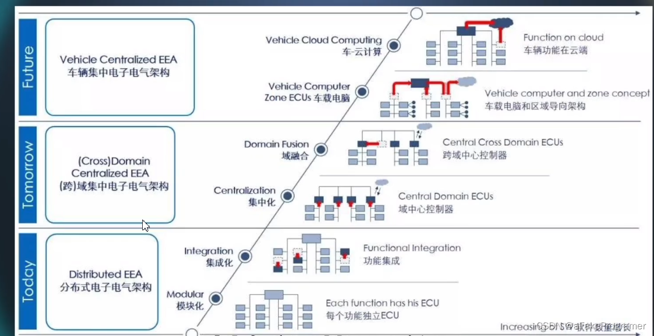 智能座舱,云服务,以及未来可能存在的包括自动驾驶,智能家庭等。都需要汽车作为一个拥有一定算力的智能设备而存在,并且汽车的功能迭代会更快,需要汽车本身的电气电子架构,能由更好的软件操作能力,和更快的内部通信能力。