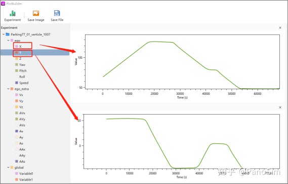 PanoSim拥有PlotBuilder模块用于对数据的存储与分析,存储信息包括三大类:主车姿 态信息、主车动力学信息以及全局变量,下面是主车泊车过程中的X/Y曲线图,如图6.34。