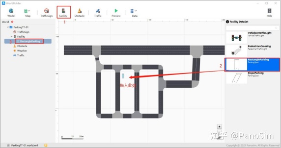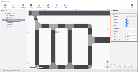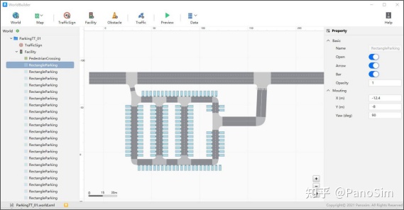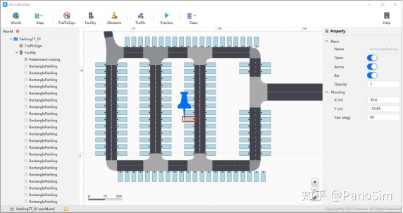 在WorldBuilder中,点击上方工具栏“Facility”,选中右侧栏“RectangleParking”,拖入主 界面,如图6.25。点击左侧树状栏可以设置车位的位置及朝向角,如图6.26。PanoSim支持 一键复制功能(如图6.27),可高效快速构建停车场场景。搭建好的停车场场景如图6.28。 可以在停车场中加入随即交通流,同时可以对天气环境关照进行设置。