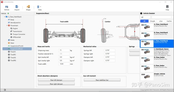 测试前需要对测试车辆进行部分数据标定,或者针对测试车辆重新构建车辆模型, VehicleBuilder 模块支持客户车辆导入,支持对导入车辆以及 PanoSim 自带车辆模型进行参 数修改。这里选用 PanoSim 自带车辆模型 C_Class_Hatchback。