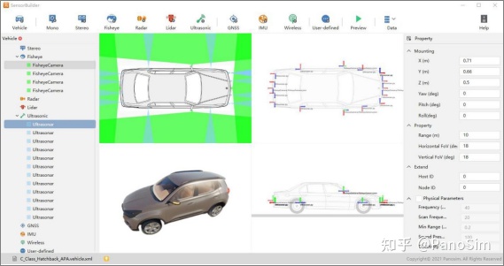 实验搭载12个超声波雷达,采用前中后4、4、4的布局方式,有效探测主车周边目标物 位置信息。搭载4个鱼眼摄像头,分别处于车前后保险杠以及左右后视镜的位置,精确识别车位线。分别对传感器安装位置参数X/Y/Z/Yaw/Pitch/Roll,传感器内参Range/Horizontal FoV/Vertical FoV进行设置,形成以下布局,如图6.30。