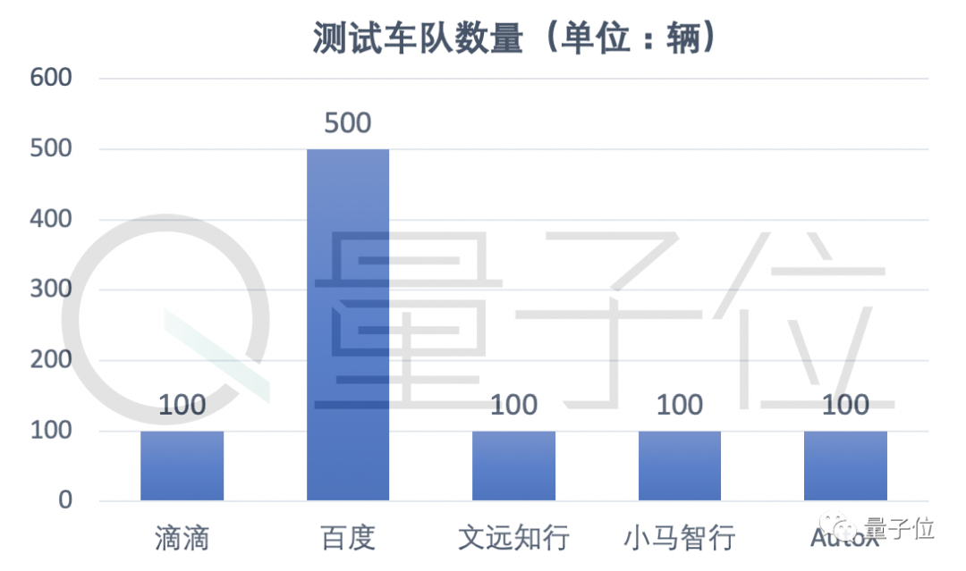 而从测试车队规模来看,国内普遍在100-200辆,只有百度目前有500辆级别测试车队: