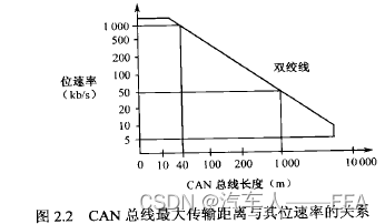 CAN总线:串行数据通信总线,两个任意节点之间最大传输距离与位速率的关系(CAN传输速率1Mb/s,最大传输距离为40m)