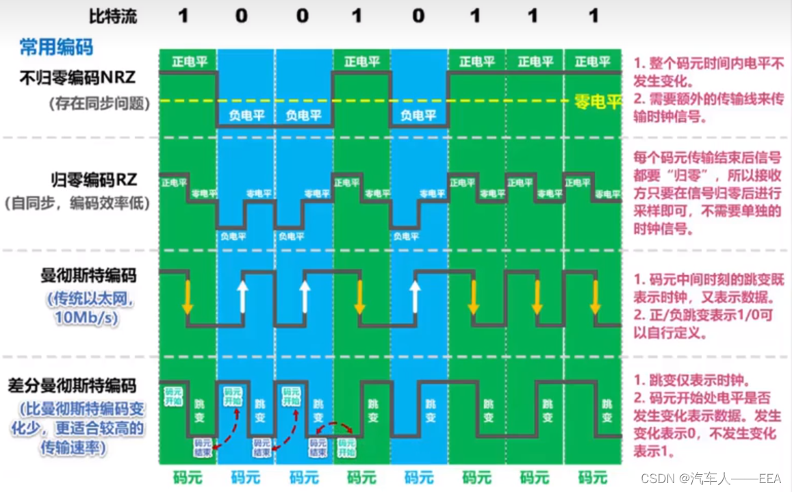 每位数据由两个连续跳变的时间和电平共同决定,两个连续比特的电平不同。
