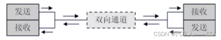 数据的发送和接收用两根不同的数据线,通信双方在同一时刻都能进行发送和接收。通信双方都有发送器和接收器,发送和接收可同时进行。