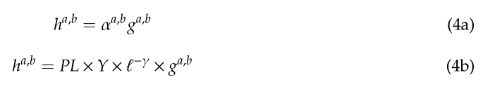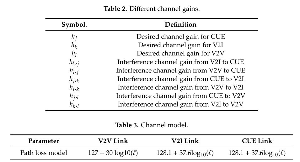 表2展示了不同信道的功率增益。假设所有UE共用一个对数正态阴影分布。[16]中提出了车辆通信的信道模型。表3展示了三个种类UE的PL模型,其为具有不同阴影标准差的瑞利衰落信道。VUE中a和b的信道增益由4a表示,信道功率增益由PL和阴影决定(4b),其中为对数正态的阴影成分,l为发送端和接收端的距离,