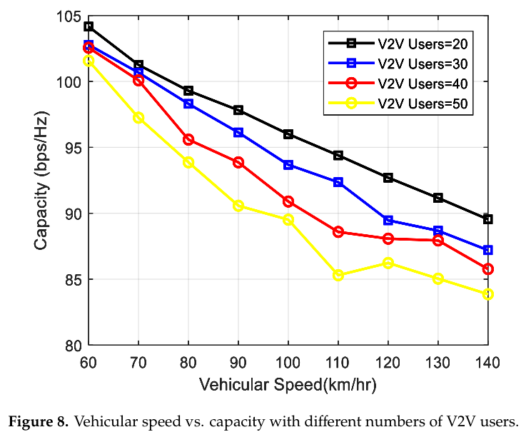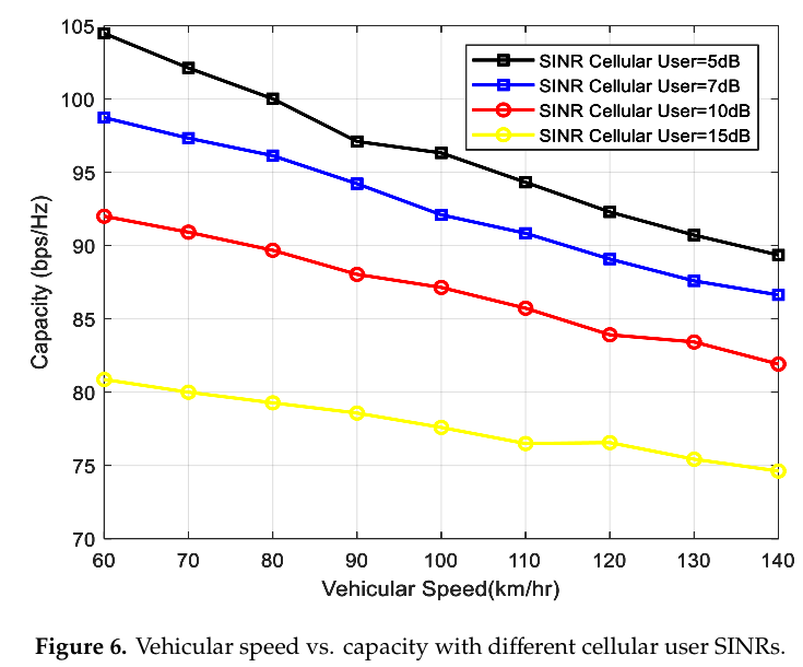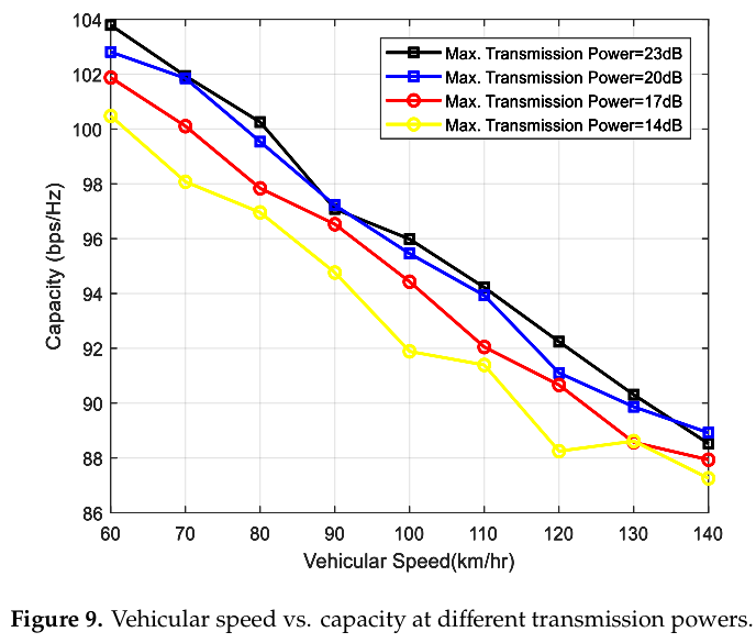如上图,速度变化时,V2I发射功率和信道容量的关系。增加发射功率可以增大信噪比,进而获得更大的信道容量,但是来自其他用户的干扰也会更大,上图可以看到23dB和20dB信道容量的差别不大。因此功率和干扰之间需要权衡