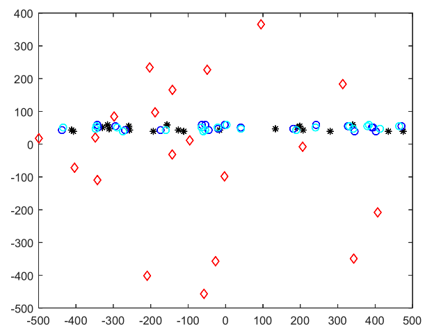 图2展示了cell内UE的分布情况,CUE用红色表示,其散布在半斤500m的cell内,VUE穿越cell中心的在高速路上移动(用蓝、黑、紫表示)。