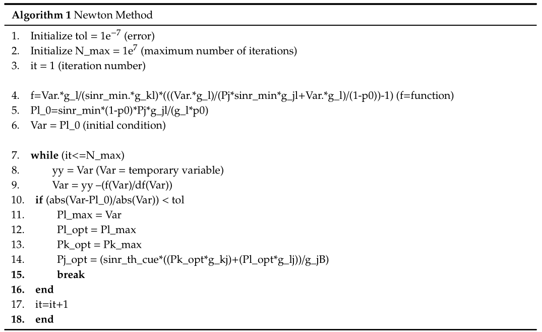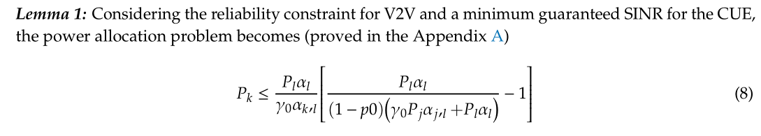 最大化信道容量的第一步是计算最优的功率分配。[10]中对V2I V2V用户的最优功率进行了评估,这里将其扩展为适用于三种UE的情况,这里假设CUE的最小需求SINR已知,并且将AWGN从SINR公式中去掉(这是因为已经推导出干扰比AWGN大得多)。