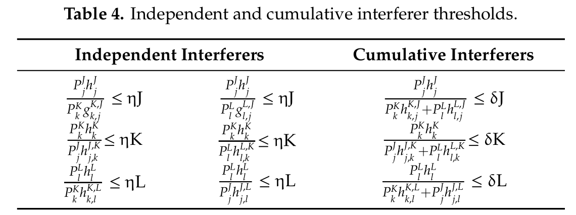 为了分别找到独立和积累干扰,首先定义SIR(信干比),表4总结了用于构建一个图的所有等式。选择SIR阈值是为了去欸的那个eNB受到的干扰的严重程度。超边中的组的大小可能不同,举个例子如图4所示,在一个超边中考虑由三个节点构成的组。