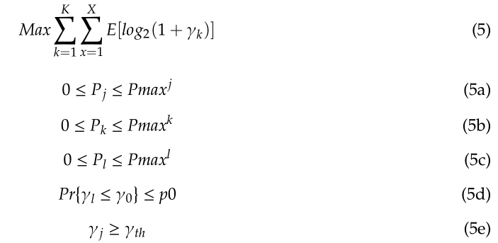 上式的表示的是V2I链路的SINR,(5)式的Max正体现了对V2I链路的容量最大化的期望,(5d)体现了将V2V中断概率作为限制条件,(5e)体现了将CUE的SINR作为限制条件。