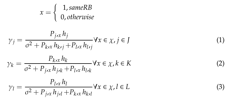 BS来自CUE、V2V、V2I的接收SINR用式(1)~(3)表示,用x表示两个链路是否分配到同一个RB上。