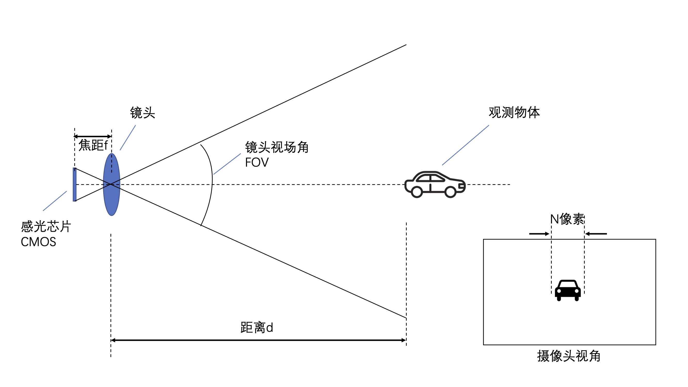 大部分的自动驾驶算法采用了卷积神经网络来识别物体,如果物体占据的像素点过少,则会被算法过滤掉,当做噪声处理。为了达到识别的效果,通常认为至少需要24个以上的像素来做判断,因此我们可以定义物体最小可分辨像素数为24,由此得出不同大小的物体,摄像头能观测到的最远距离。