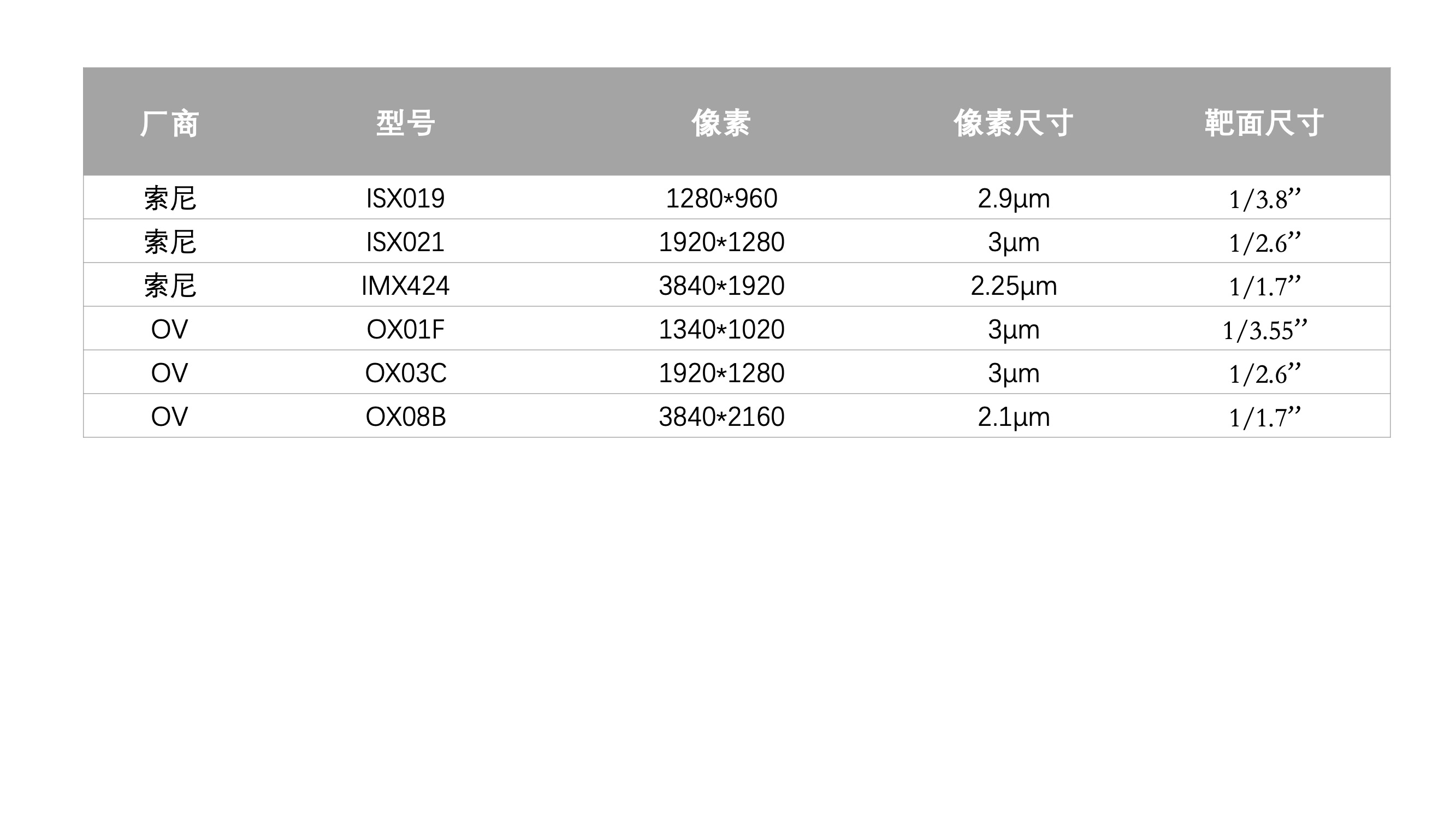 表2:常见的车规感光芯片的像素和靶面尺寸(单位为英寸)