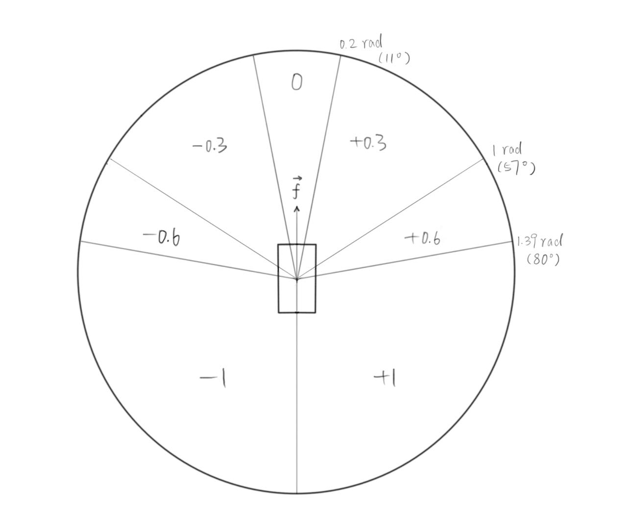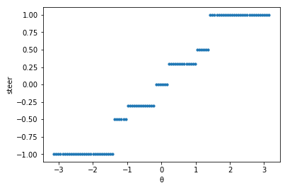 但控制方向的参数steer的范围是[-1,1](代表方向盘从最左转到最右),如果将θ值直接用作方向盘的旋转量,当目标地点的角度超过1弧度(57°),方向盘就会打死。除此之外,在方向角有细微变动的时候,汽车的方向盘也会跟随变化,容易导致汽车左右来回摇摆。因此,考虑采用量化的方式,完成方向角到方向盘旋转量的转化。