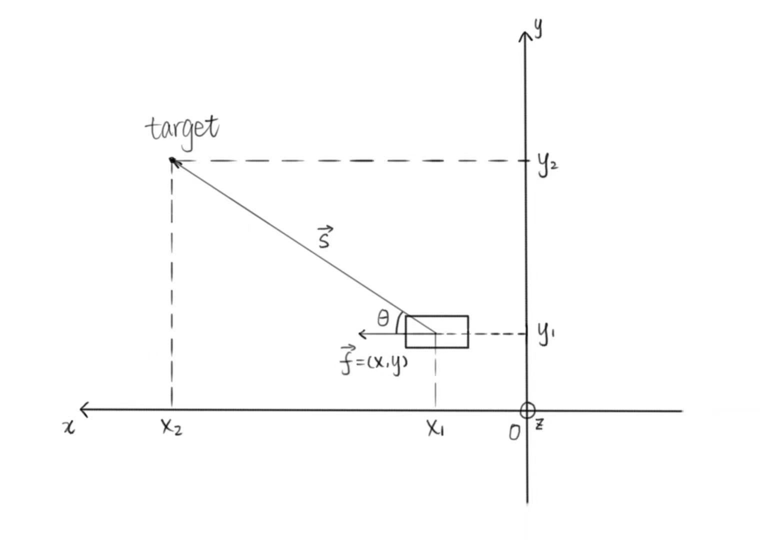 在简单的测试环境下(暂时不考虑移动障碍物或信号灯),可以将汽车的巡航速度设置成一个恒定值。寻路的重点在于,如何根据汽车自身的坐标和方向,及目标点的坐标,计算出转向的角度。对于路线在海拔上的高度变化,汽车无法通过方向盘控制,所以目前只考虑平面上的移动(xOy坐标系)。