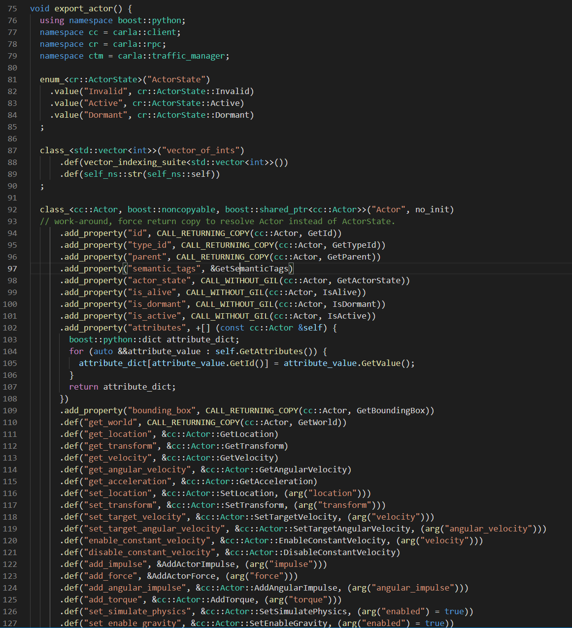 我们随便看一个文件,例如PythonAPIcarlasourcelibcarlaActor.cpp文件,具体的绑定用法需要读者自己去了解boost::python