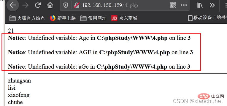 echo $age,$Age,$AGE,$aGe;//变量严格区分大小写,只有第一个输出,后面三个都报错Notice: Undefined variable: