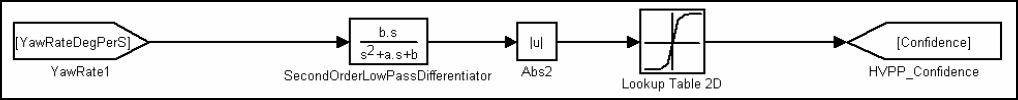 为了使PP模块能够提供高精度的预测路径,车辆必须处在稳定状态情况下。通过对横摆角速度信号进行计算来确定自车是否处于稳定状态。PP模块通过获取车辆横摆角速度变化率来确定车辆是否在稳定状态。置信度的计算具体通过图2-5中离散二阶低通滤波器来实现的。为了能够在动态驾驶的情况下获得路径半径计算,置信度滤波器的截止频率较高。这保证了置信度指示器能够在半径变化输出之前报告置信度变化。
