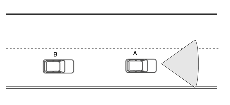 两车之间具备无线通信能力,车辆 A、B 同向行驶在同一车道上,B 车视野可能被 A 车挡住