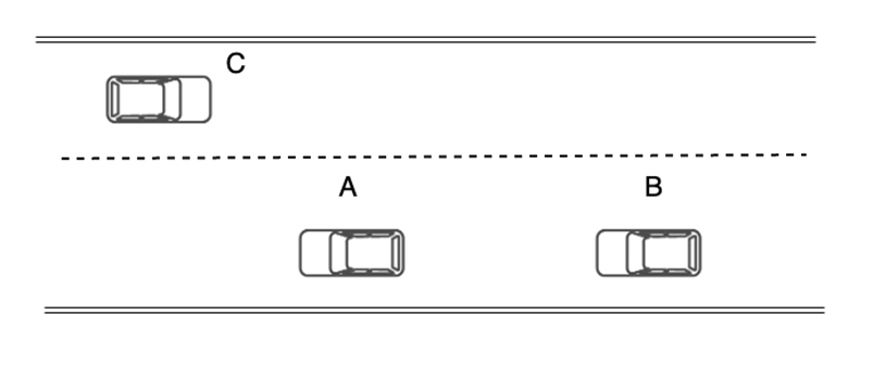 逆向超车预警指的是两车行驶于同一车道时,其中的某辆车因为借用逆向车道超车,与逆向车道上的逆向行驶车辆存在碰撞危险。如图所示, A 车与 B 车位于同一车道行驶,C 车从相邻车道逆向驶来,若此时 B 车占用逆向车道进行超车,由于 B 车视线可能被 A 车遮挡,B 车和 C 车存在碰撞可能,逆行超车预警系统(DNPW)会对 B 车驾驶员进行预警。