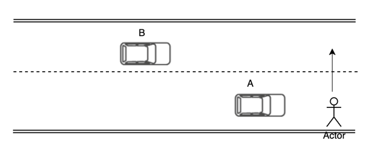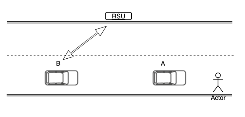 车车之间或车人之间没有 V2X 通信能力,车辆 A、B 同向行驶在同一车道上,B 车视野可能被 A 车挡住,B 车与 RSU 具备无线通信能力