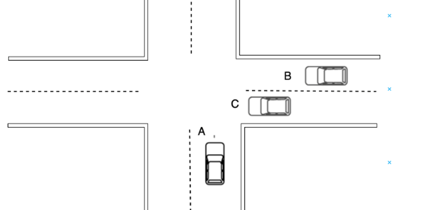 交叉路口碰撞指的是在交叉路口,A 车驶向交叉路口时与侧向行驶的 B 车发生碰撞。如图所示。A 车行驶在路口,B 车从左侧或右侧驶向路口,A 车视线可能被 C 车遮挡,从而跟B车产生碰撞,交叉路口碰撞预警系统(ICW)会对 A 车驾驶员进行预警。