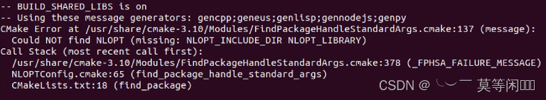 CNake Error at /usr /share/cnake-3.10/Nodules/FindPackageHandlestandardArgs.cmake:137 (nessage);could NOT find NLOPT (missing: NLOPT_INCLUDE_DIR NLOPT_LIBRARY)