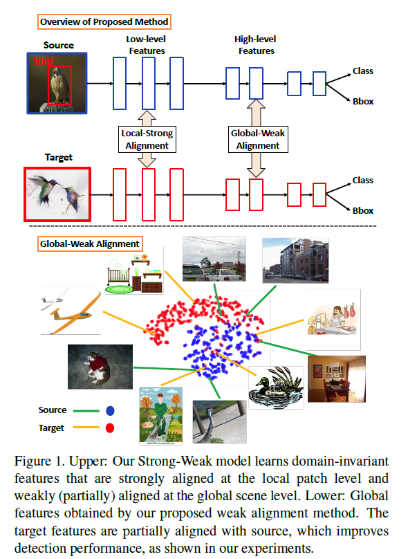 在图像分类中无监督域适应方法中,大多数是尽量使得目标域数据和源域数据完全匹配。作者认为,在目标检测任务中,由于不同的域有着不同的场景布局和目标组合,完全匹配目标域和数据域的分布将降低模型的 performance。但是,由于 low-level 局部特征匹配不会改变原有的类别语义信息,所以可以将它们进行强匹配。基于上面两个原因,作者提出了: