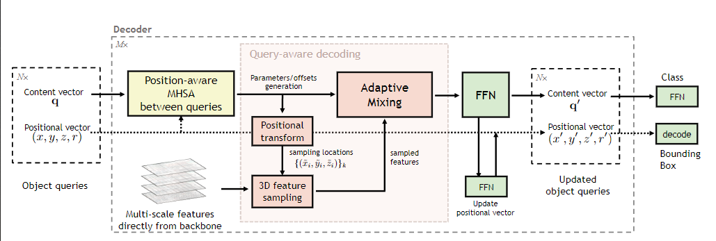 - 自适应三维特征采样器:通过将backbone中的多尺度特征映射作为一个三维特征空间,本文提出的解码器可以灵活地在空间和尺度上对特征进行采样,以自适应地处理基于查询的物体的位置和尺度变化
