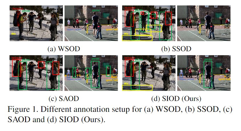 - 不同目标检测区别如下图:弱监督(WSOD)、半监督(SSOD)、稀疏标注(SAOD)、单实例(SIOD)