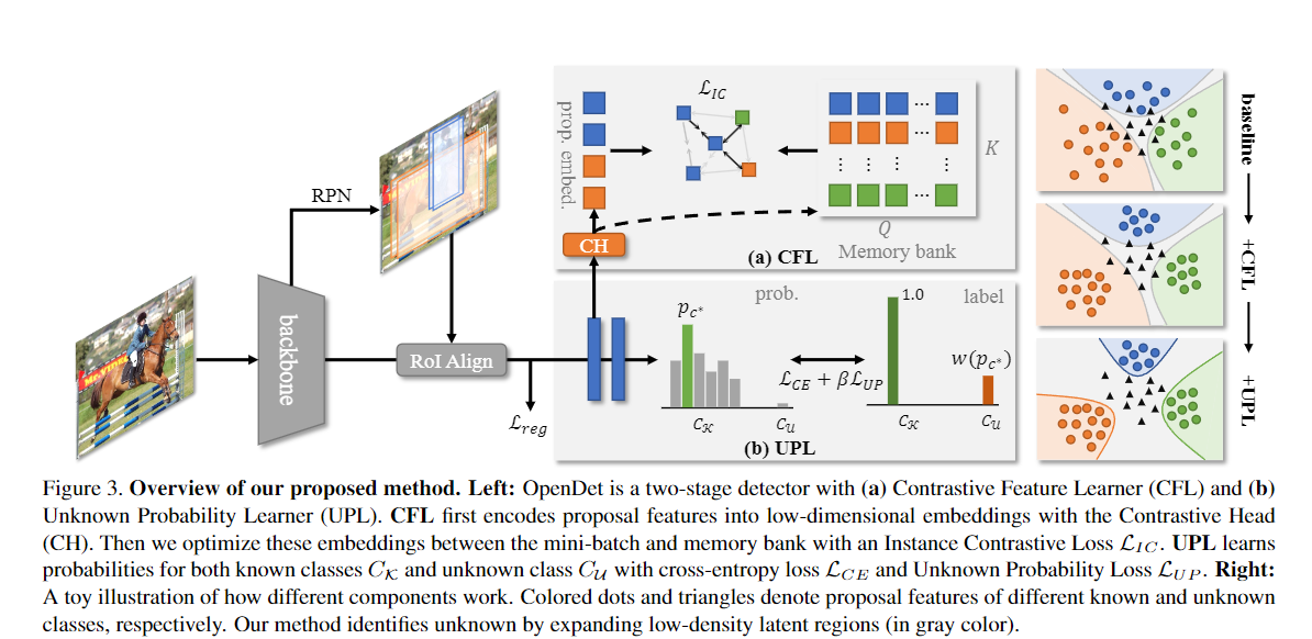 - 提出了一种新的开集检测器(OpenDet) ,它有两个设计良好的模型,**对比特征学习(CFL) **和 未知概率学习(UPL),可以通过端到端的方式进行训练,并直接应用于开集环境。