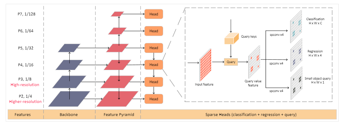 - 级联稀疏查询:首先在低分辨率特征上预测小目标的粗略位置,然后在高分辨率特征上集中计算相应的确切位置。这个过程可以看作是一个查询过程: 粗略的位置是查询键,用于检测小对象的高分辨率特性是查询值